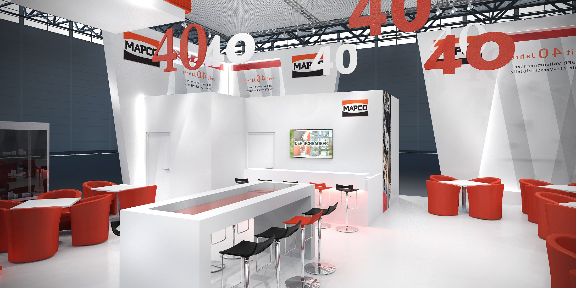 Exciting lighting effects in walls and furnitures underline the white-red colour concept.