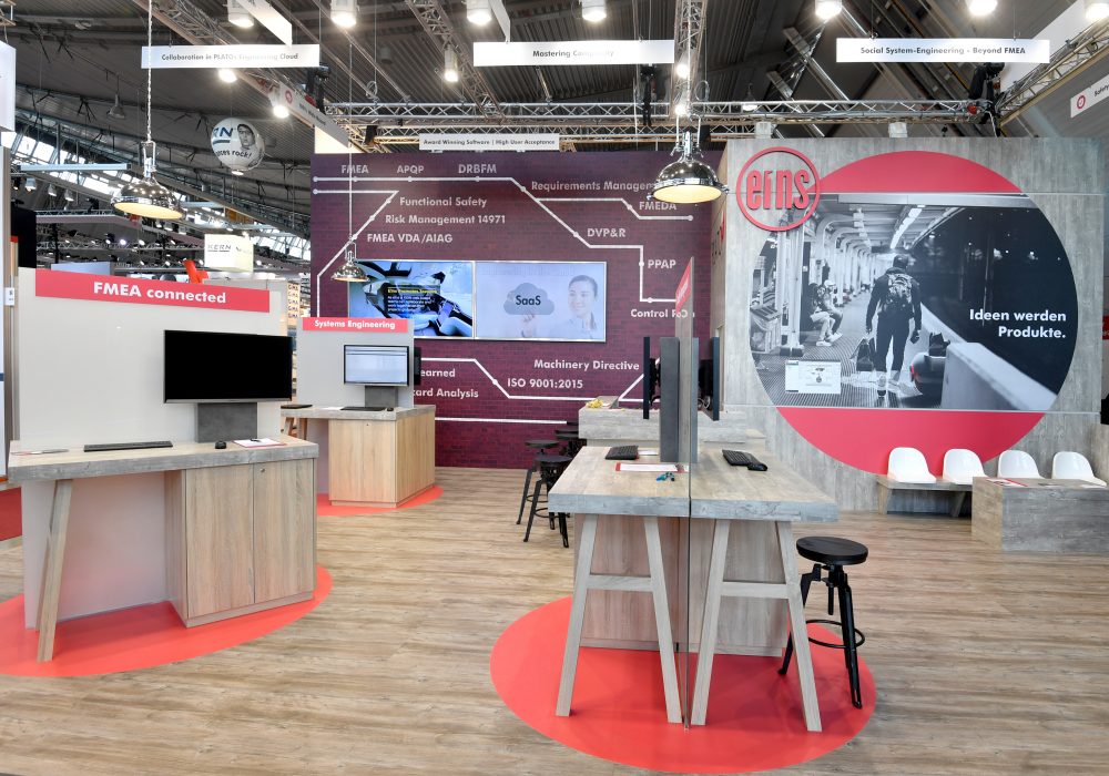 On 70 m² an impressive and modern booth concept arose through the use of wood, warm colours and materials in the industrial look.