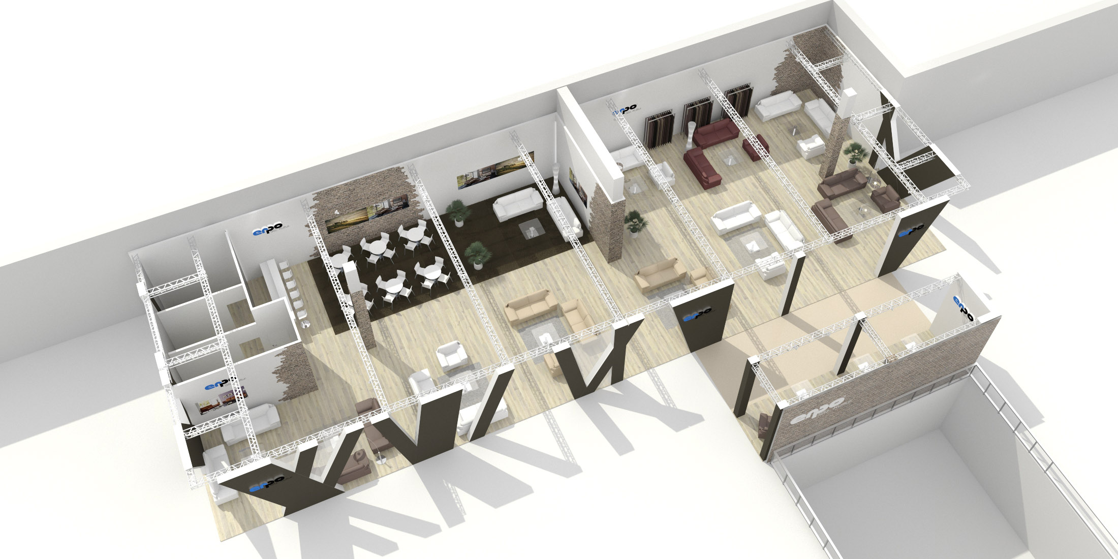 Originelle Stützwände und schlichte Formen und Farben verleihen dem Standkonzept sein hochwertiges, modernes und dennoch zeitloses Design.
