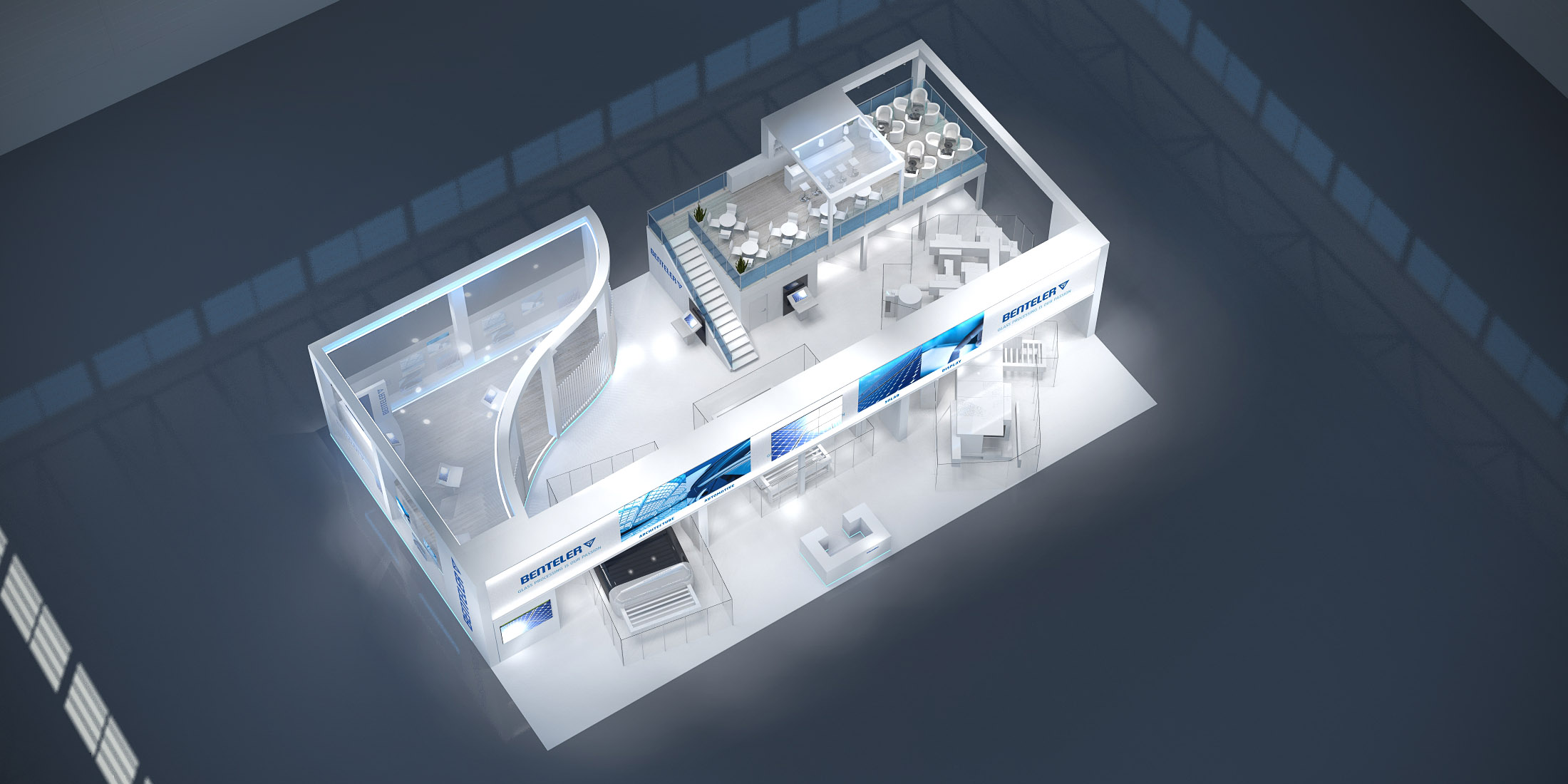 Auf der Glasstec in Düsseldorf realisierten wir einen 480qm großen Messestand. Highlight waren die stilvolle Lounge mit Theke, die sich auf einem separaten Obergeschoss befand, sowie die abgetrennte Technology Lounge.